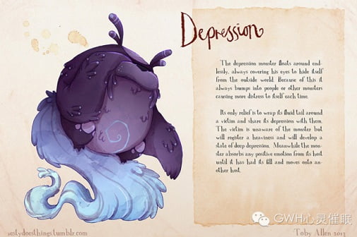 画家Toby Allen笔下的抑郁症拟人。“抑郁怪兽永无止境地飘来荡去,总是遮住自己的眼睛躲开外部世界,但结果是它会不停地撞在别人身上,每一次都给自己带来更大的痛苦。”
