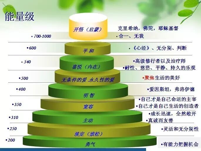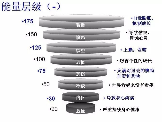美国著名心理学家大卫`霍金斯(David R. Hawkins, Power vs. Force)曾对人自身的情感频振做了一个能量级划分,我们可见处于最低能量级层的是羞愧和内疚。